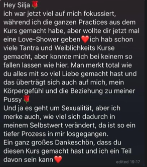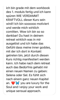 I have just finished the workbook of module 1 and I can feel HOW DAMN POWERFUL this course is!!! I am sooooo motivated and really will commit. Wow I am so grateful! In the retreat you have awakened something inside me and I have the feeling that the inner goddess that I have felt there, will now be really manifested through this course...It feels like a new chapter ❤️🦋 You are luxury for the soul and I enjoy your work and unique sensual approach.